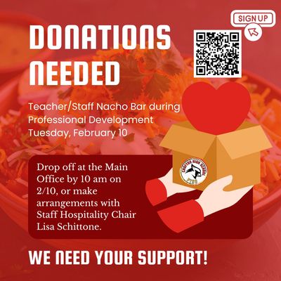Let's show the incredible staff some love with an amazing nacho bar! Please review the sign up linked below. All donations need to be dropped off at Crofton High School (labeled PTSO) by 10:00 am on Tuesday, February 10, 2026. If you would like to make other drop-off arrangements, you can contact Lisa Schittone at 410-852-0253. We cannot do this without your support. Thank you so much! Sign up here: https://www.signupgenius.com/go/10C0A4DABAC2DA4F5C70-61794954-staff#/