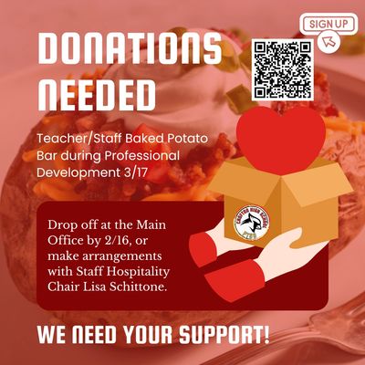 We are setting up a baked potato bar for the staff on St. Patrick’s Day, March 17, 2026. Outback is donating all the potatoes! We are asking for help getting drinks and desserts to complete the lunch. All donations need to be labeled PTSO and dropped off at the school office by March 16th. If you would like to make other arrangements, contact Lisa Schittone 410-852-0253. Please consider helping to make this event amazing. Thank you!